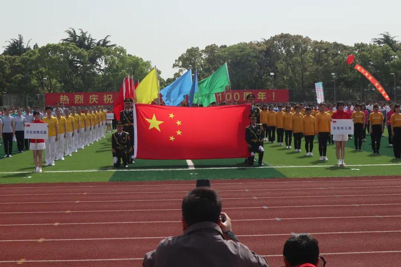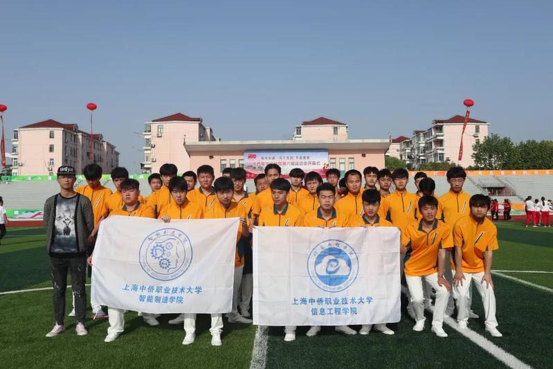 4月30日上午,由信息智能初心志愿服务队中遴选的40名学生组成的彩旗队赴金山区社会体育管理中心体育场参加“百个支部  千名党员”体育展示活动暨第六届运动会开幕式。